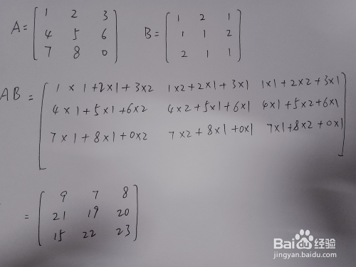 下面我给大家举个例子 矩阵A=1 2 3 4 5 6 7 8 0 矩阵B= 1 2 1 1 1 2 2 1 1求AB