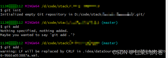 3.输入git add . 将项目上所有的文件添加到仓库中的意思,如果想添加某个特定的文件,只需把.换成这个特定的文件名即可