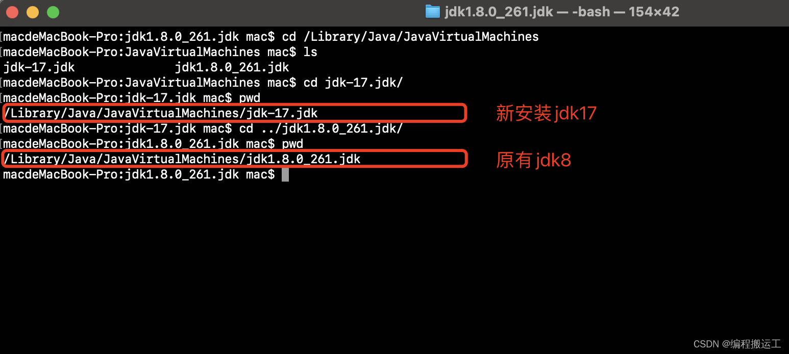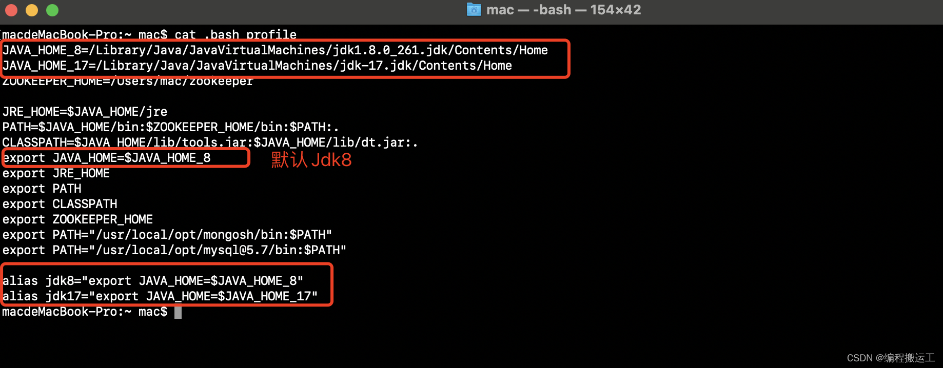 我们定义了2个别名:jdk8和jdk17。默认配置的是jdk8,如果要切换jdk17,则在终端中执行命令:jdk17。如果要切换回jdk8,则执行命令:jdk8。