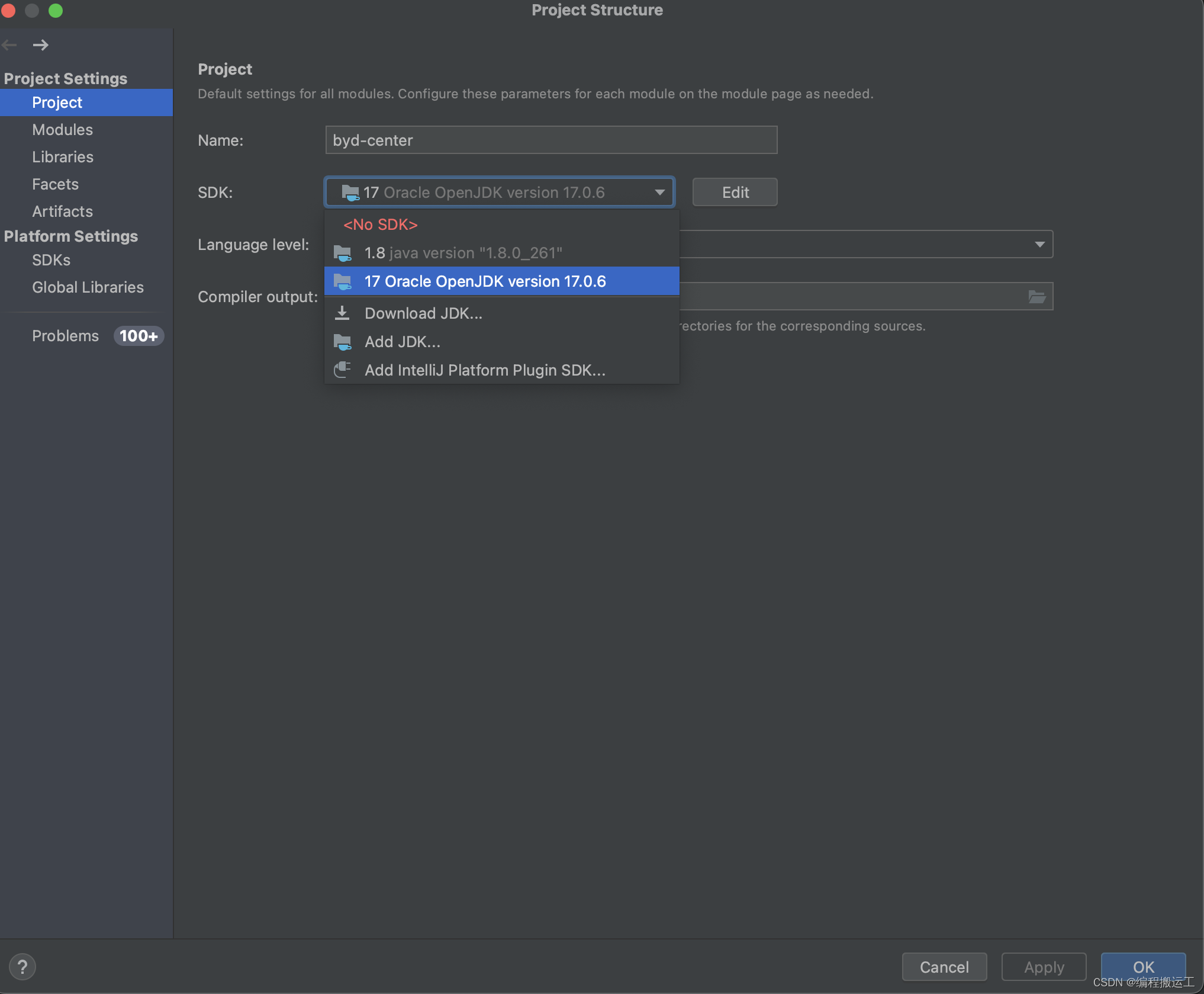 在File -> Project Structure -> Project配置中,选择SDK新增,直接点击ADD JDK然后打开 /Library/Java/JavaVirtualMachines这个目录下,选择你想要的jdk版本对应的文件夹就ok,idea会智能匹配。(本图我的jdk17已经配置成功了。)