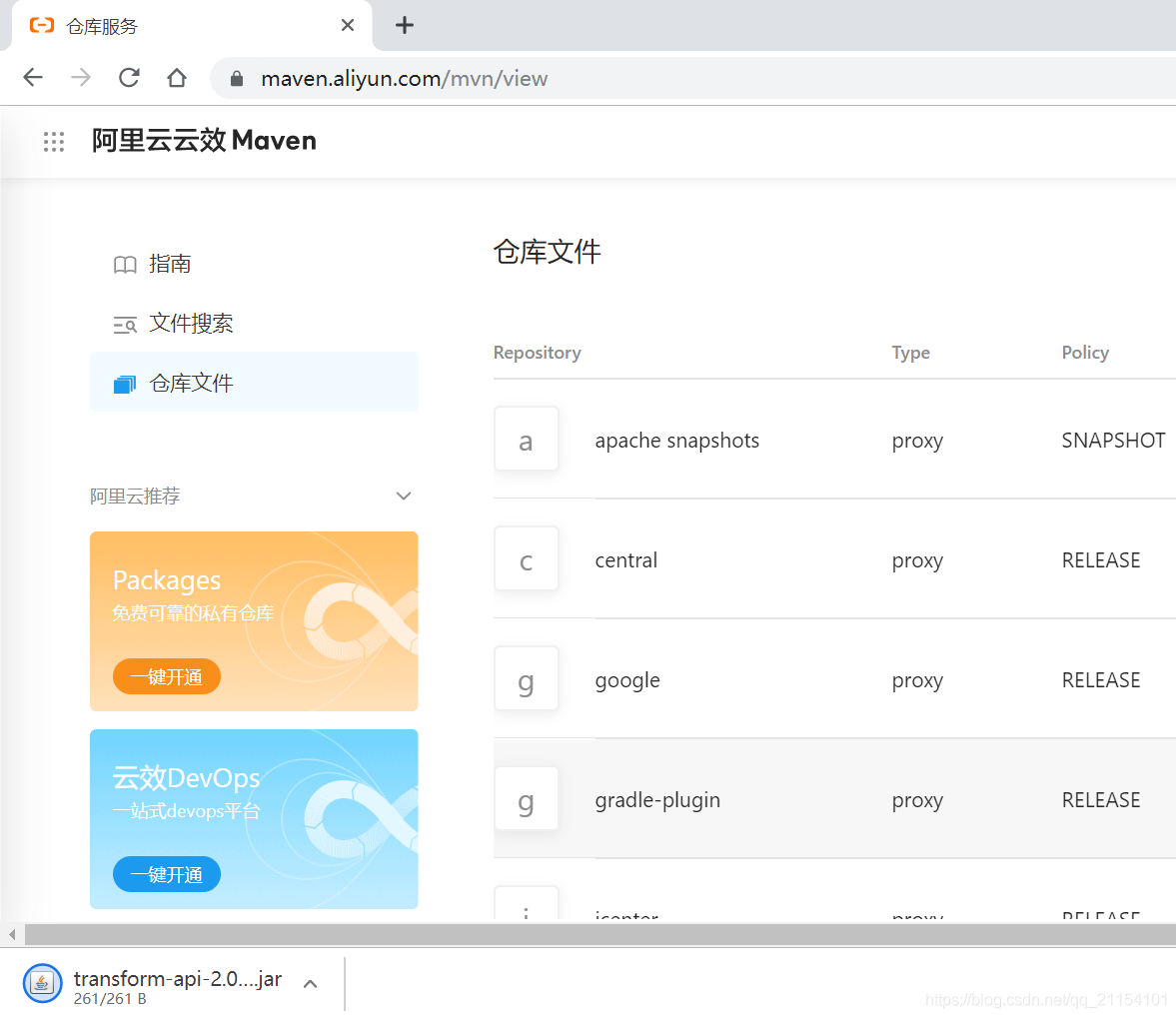 那么,接下来一步步地去尝试解决这个问题。首先,通过百度到的答案,尝试导入证书。这次搜到了一个简单的方式,不用写JAVA代码了。访问阿里云仓库,导出证书,然后在AS中导入:
