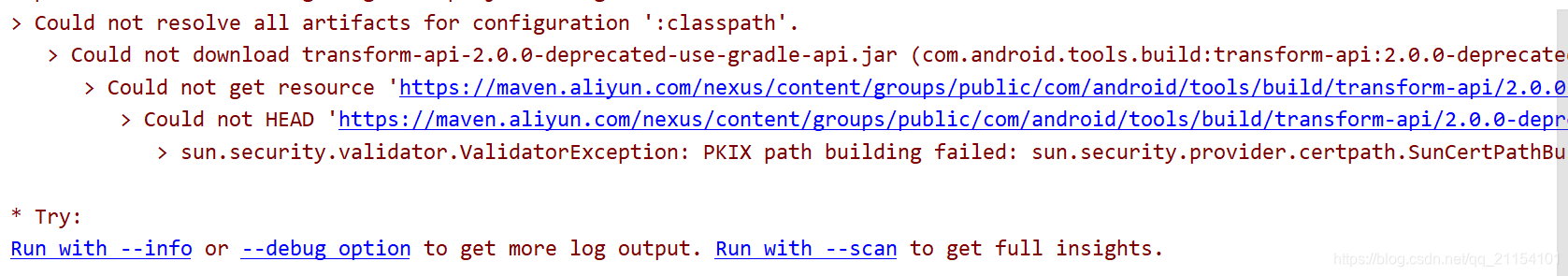 点开,查看详细的报错,看上去像是某个依赖库从阿里云的maven仓库无法下载: