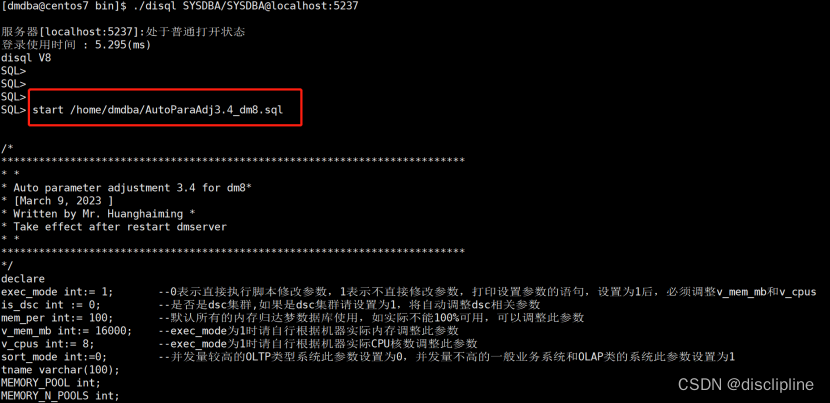 可通过设置 disql 的参数,来调整交互界面的显示效果,以达成输出的显示结果更加直观。通过 set 命令语法进行使用,off 表示该参数关闭,on 表示该参数开启。可以同时 SET 多个环境变量,如:Set heading on timing on。