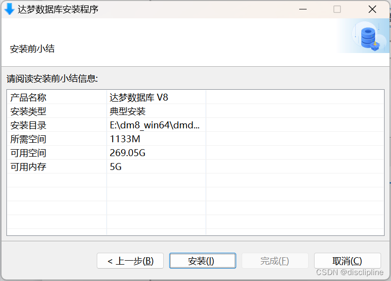 显示用户即将进行的数据库安装信息,例如产品名称、版本信息、安装类型、安装目录、可用空间、可用内存等信息,用户检查无误后点击【安装】按钮进行 DM 数据库的安装