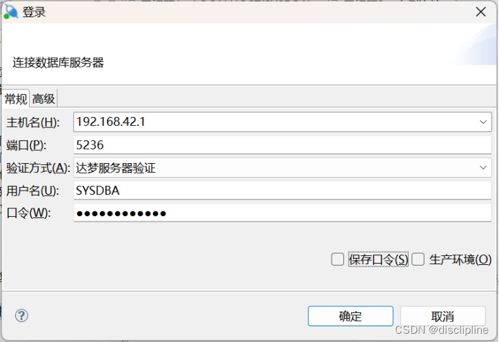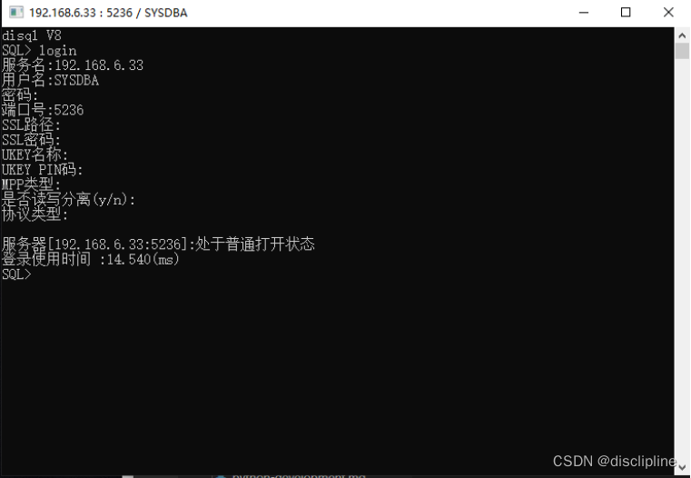 以 LOGIN 为例,登录到 IP 地址为 192.168.6.33 的机器上,用户名和密码为:SYSDBA/SYSDBA,端口号为 5236。其他全部敲回车,采用缺省输入,密码不会显到屏幕上。如下图所示: