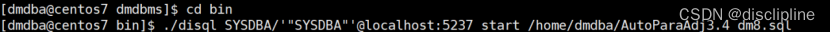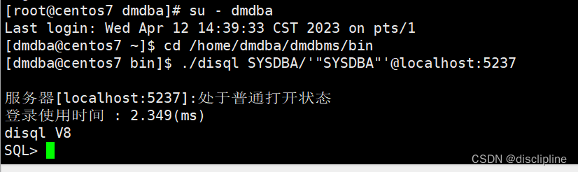 Linux 登录,进入数据库软件安装目录的 bin 目录下。登录方式为:./disql username/password@IP:PORT