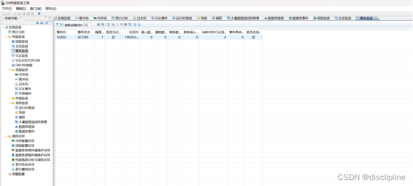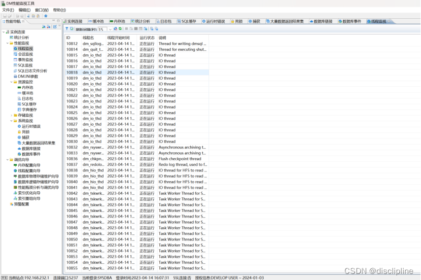 线程监视:可以看到线程的一些情况,如正在等待的线程信息、等待事件的历史信息、命令的历史信息、检查点的历史信息等。