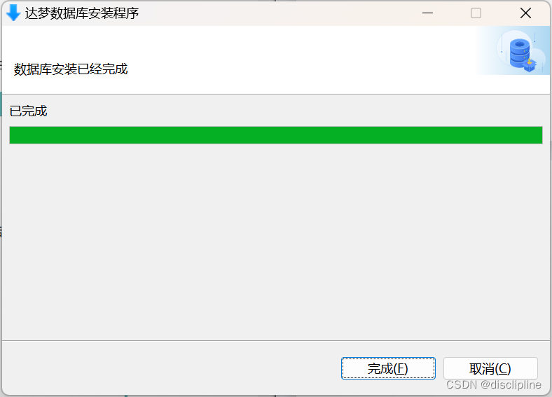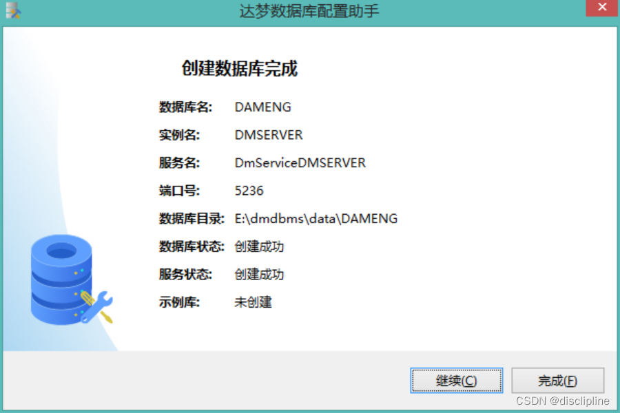 安装完成后将弹出数据库相关参数及文件位置。点击【完成】即可,如下图所示: