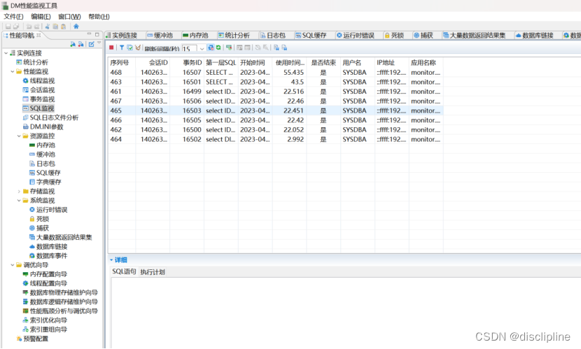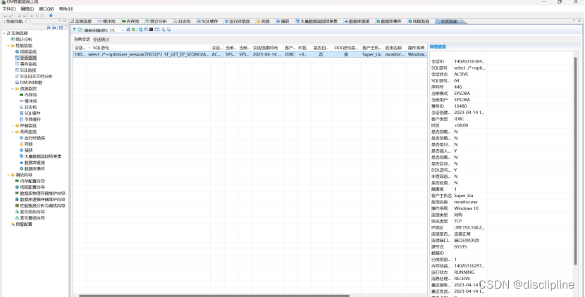 会话监视:该功能可显示会话的相关信息,例如创建时间,客户类型,用户,模式,IP 地址,执行的 SQL 语句等。通过对会话的监视可以分析是否存在频繁的连接占用系统资源等。