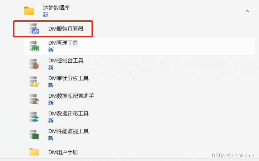 点击【开始界面】,选择【DM 数据库菜单】,点击【DM 服务查看器】,即可启动服务查看器,如下图所示: