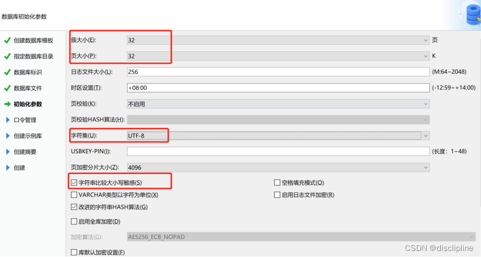 用户可输入数据库相关参数,如簇大小、页大小、日志文件大小、选择字符集、是否大小写敏感等。