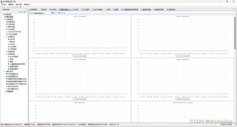 统计分析功能监视系统资源、数据库性能等。显示系统自启动以来各项资源的历史使用情况以及平均使用率。包括内存和 hash 缓存的使用情况,逻辑读写、物理读写情况,事务提交、回滚、死锁次数、会话分配和空闲的次数以及检查点的次数,SQL 的执行情况、系统 CPU 使用率以及线程切换情况。