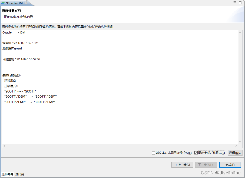 审阅列表中列出的要执行的任务,用户可查看迁移过程重要参数和修改条件,点击【完成】进入下一步操作,如需修改,可点击【上一步】进行修改。如下图所示: