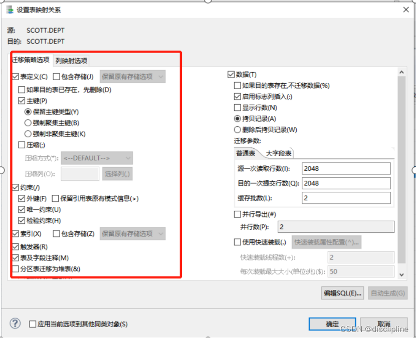 迁移策略选项:可设置迁移策略,包括表定义、主键、约束条件、索引、数据、读写行数设置等参数,可供用户调整策略。如下图所示: