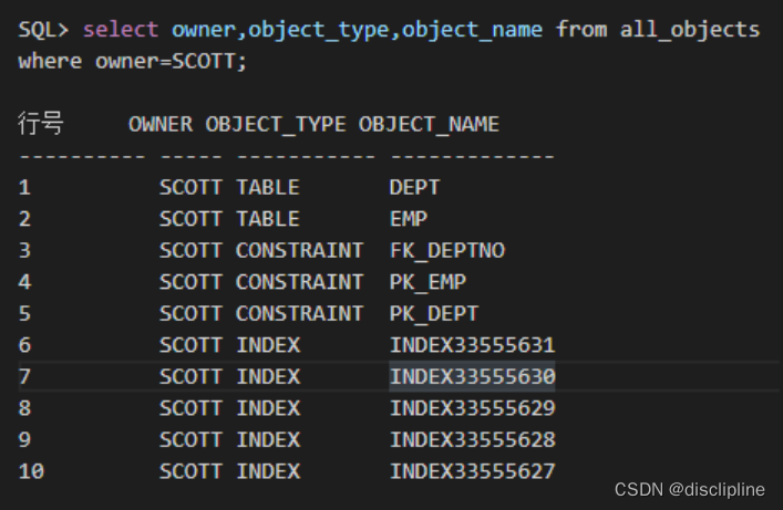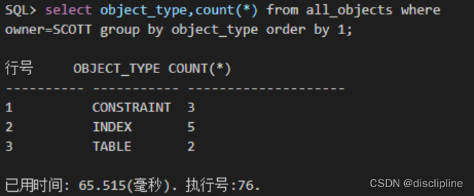 select object_type,count(*) from all_objects where owner=SCOTT group by object_type order by 1;
