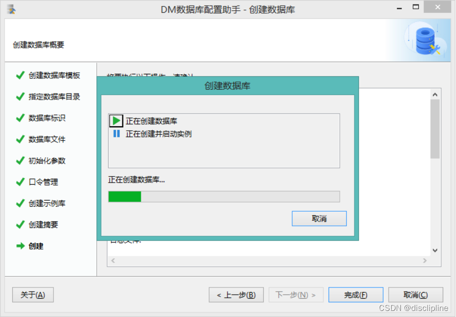 在安装数据库之前,将显示用户通过数据库配置工具设置的相关参数。点击【完成】进行数据库实例的初始化工作,如下图所示: