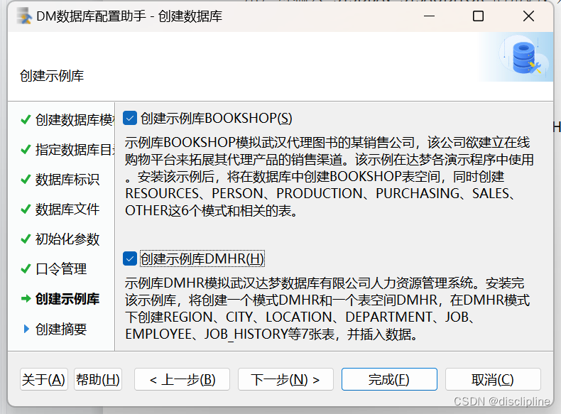 此处建议勾选创建示例库 BOOKSHOP 或 DMHR,作为测试环境,如下图所示: