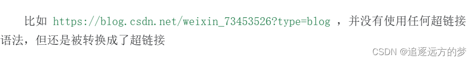 比如追逐远方的梦_C++,数字系统设计基础,Markdown入门-CSDN博客,并没有添加任何的超链接语法,但是被自动转换成了 a 标签。如果不希望自动转换,可以把链接写成行内代码,这样就不会自动转换了。