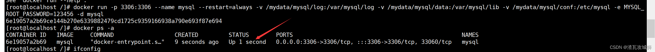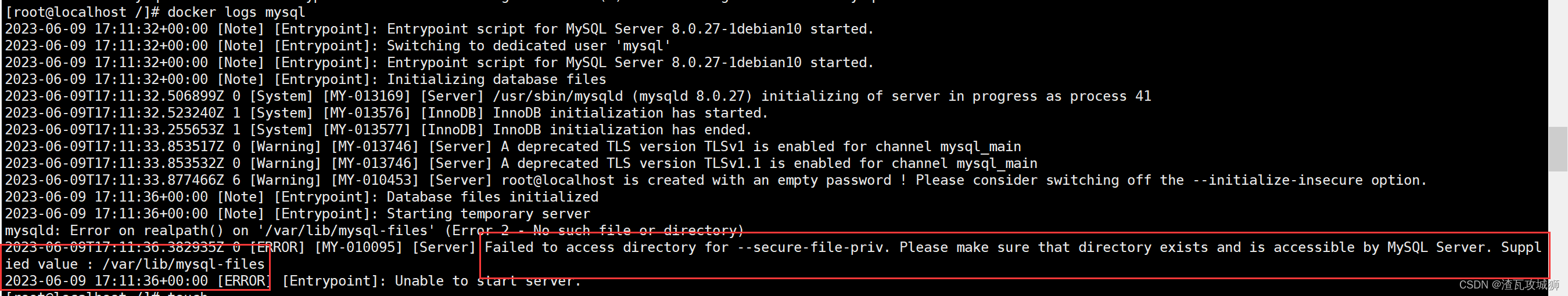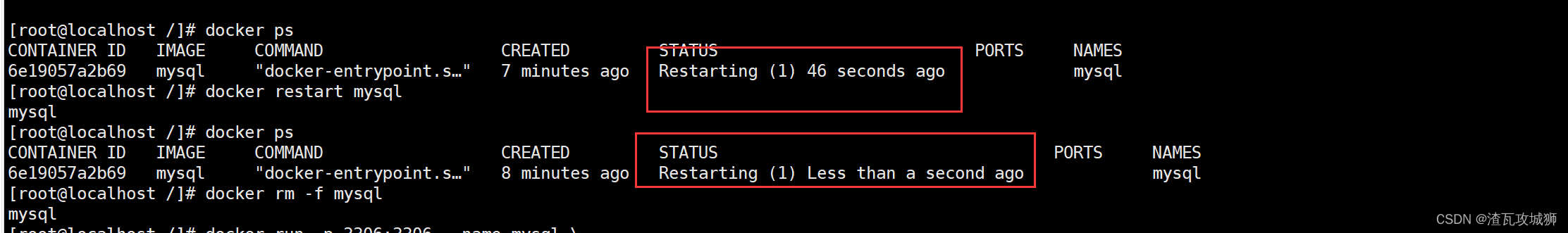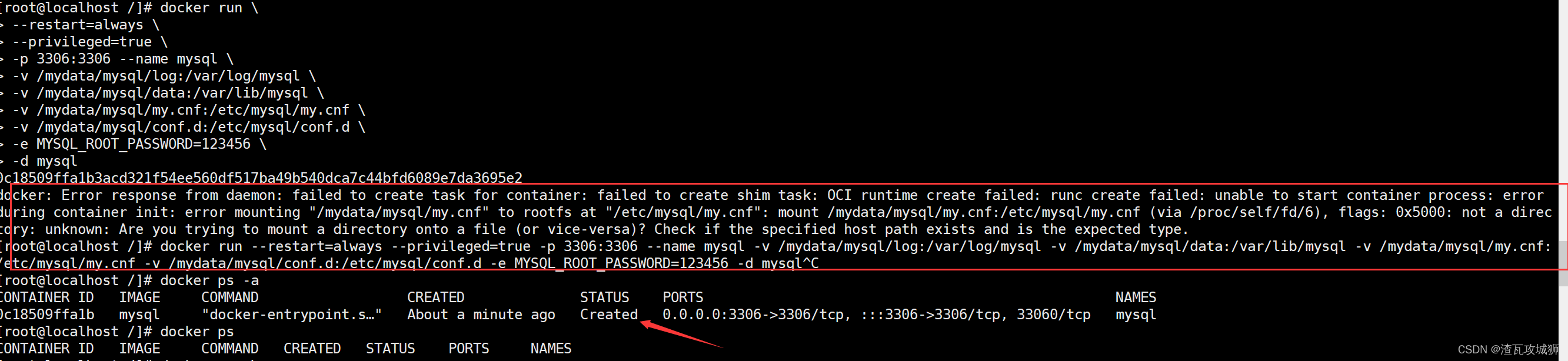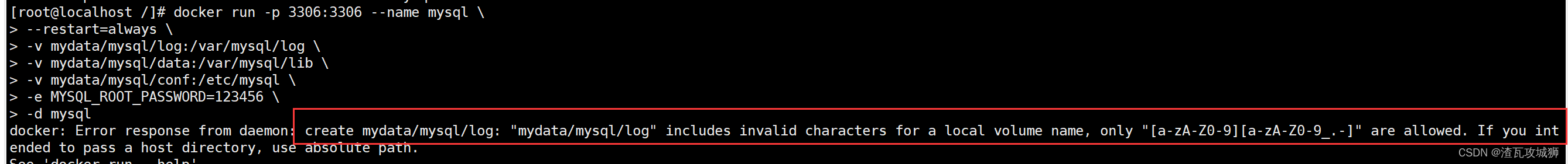 说句实话,看到这个我的第一反应是,IP地址是不是写错了或者是虚拟机防火墙开着,不允许外界访问啥的,可是我看IP没错,防火墙也被我关了。是的,我比较菜,之后就想不到什么了,之后使用Docker的ps命令发现MySql已经restart了,所以是启动出了问题,我就开始怀疑是不是我那个run的那一长串是不是写错了,最开始,我在记事本上面手写了一遍,确实最开始的时候,我写的确实有问题,问题出在目录挂载那里,前面写错,没有以/开头,后面也写错了,先mysql,报错如下: