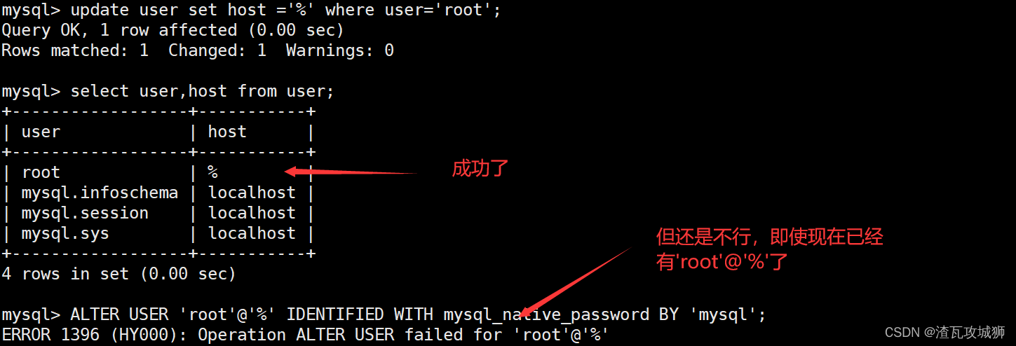 按照他之前所说的,我得先有'root'@'%'后面我使用下面这条语句将其修改成这个: