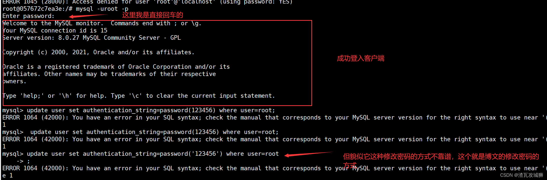 2. 知道如果客户端使用密码登不进,尝试是否可以直接回车进去,进去之后修改密码