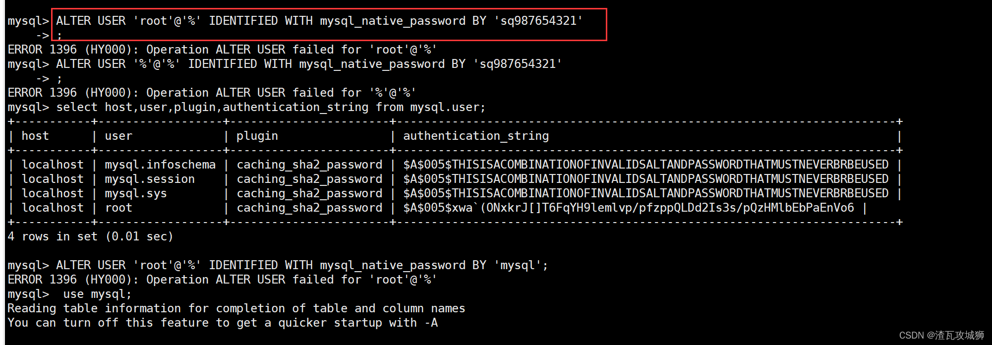 这是博文地址:(20条消息) ERROR 1396 (HY000): Operation ALTER USER failed for ‘root‘@‘localhost‘_Mr.Java.的博客-CSDN博客