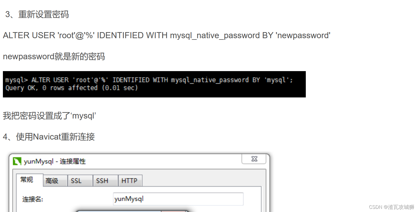 后面我又测试了一下,将其将root用户的host修改为localhost,结果确实连不上,最后还是重新修改成%然后再使用上面两步重置密码解决。