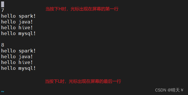 | M,对应英文的middle | 移动到屏幕的中间行 |