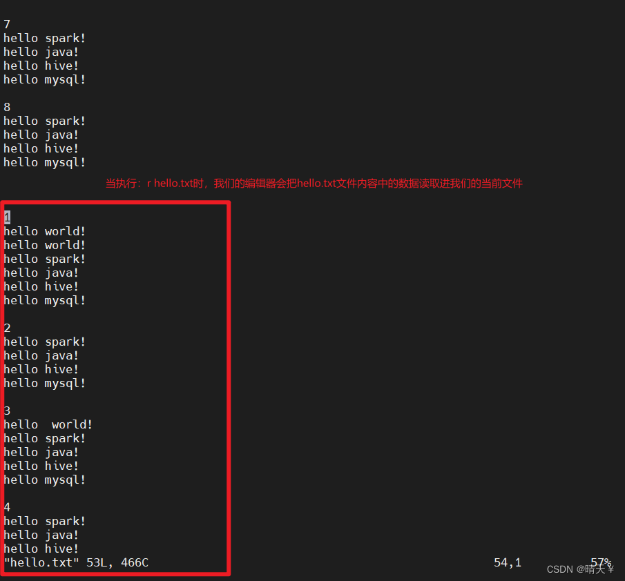 | :r file name | 将另一个文件file_name读入当前文件。将file_name文件的内容放置在新行的光标位置后 |