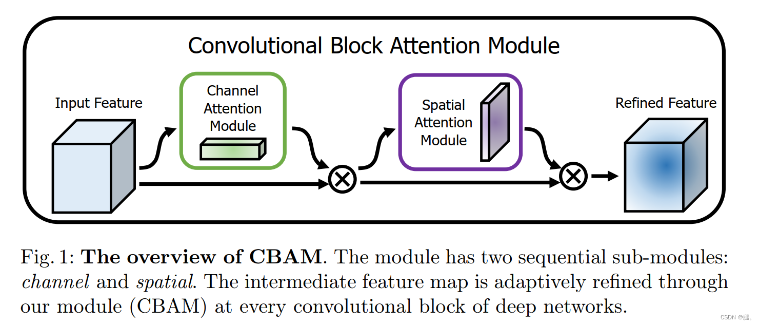 可以看到该模块由两部分组成,Channel attention module(通道注意力模块,以下简称CAM) 和 Spatial Attention Module (空间注意力模块,以下简称SAM)。
