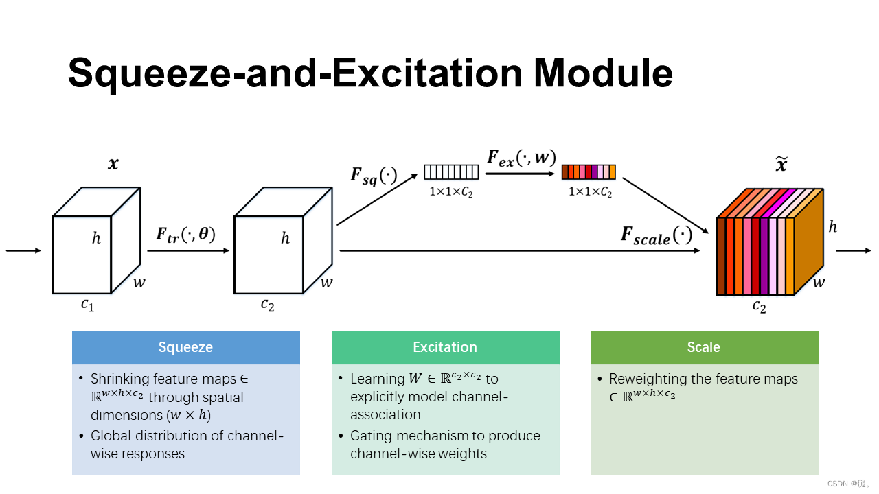 (3)Scale:将前面得到的归一化权重加权到每个通道的特征上。论文中使用的是乘法,逐通道乘以权重系数。[h,w,c]*[1,1,c] ==> [h,w,c]
