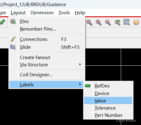 3.13 放置元件值,由于PCB图和原理图需要建立联系,如果需要原理图里的元件值同步到PCB这里,就要添加元件值,在这里选择Layout->Labels->Value,如下图。