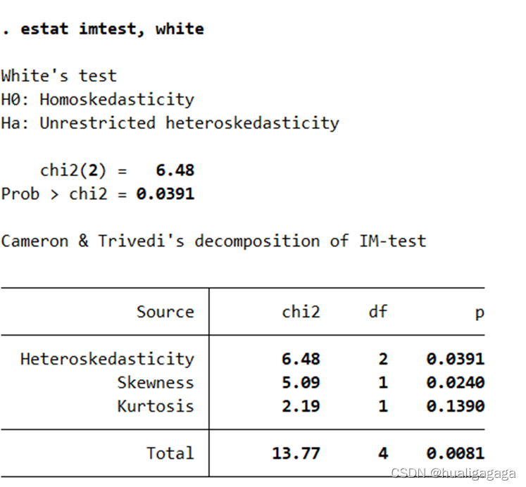 prob>chi2 的概率为0.0391<0.05,拒绝原假设,即存在异方差。