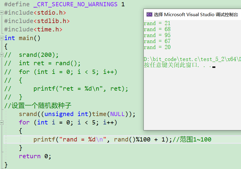 这是个猜数字的小游戏,大家可以试下。注意不要把srand((unsigned)time(NULL)) 放到game函数里面,因为你每一次猜数字,它都会重新设置一个种子,生成一个随机数。这要是猜中了,那不得是单身十年换来的🤣🤣🤣。