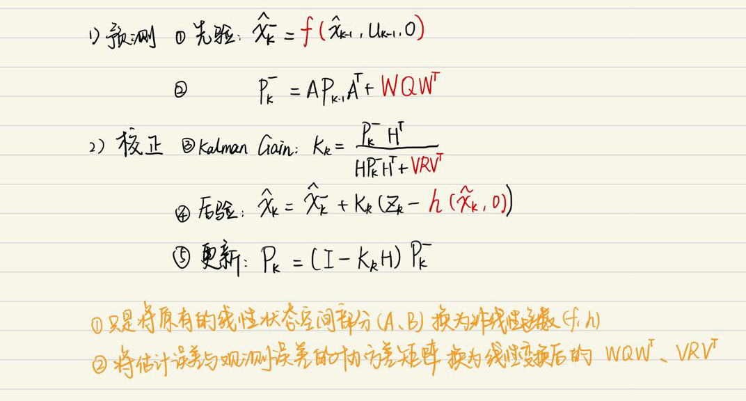 由于系统存在估计和观测等误差,无法在真实点进行线性化,模型中选取f在(k-1)时刻的后验估计点处进行线性化: