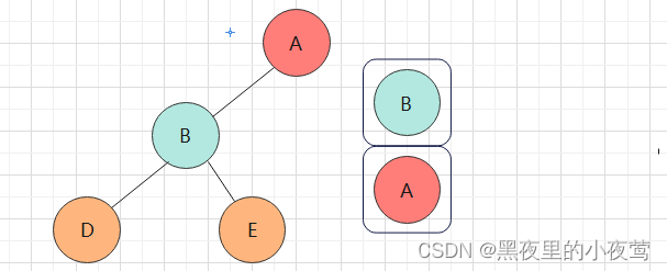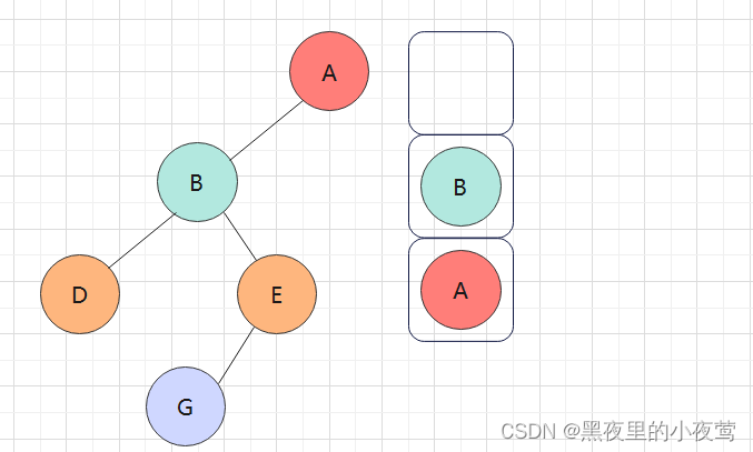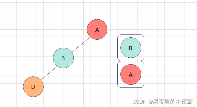 扫描到 D,创建结点赋值,然后根据 k = 1,栈顶(B)将D作为左孩子进行链接
