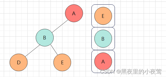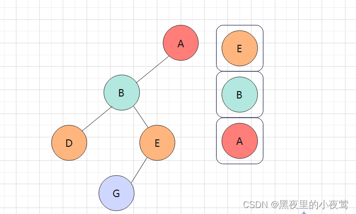然后接着扫描,扫描到E,创建结点并赋值,根据 k = 2,将C作为右孩子,链接到栈顶元素(B)