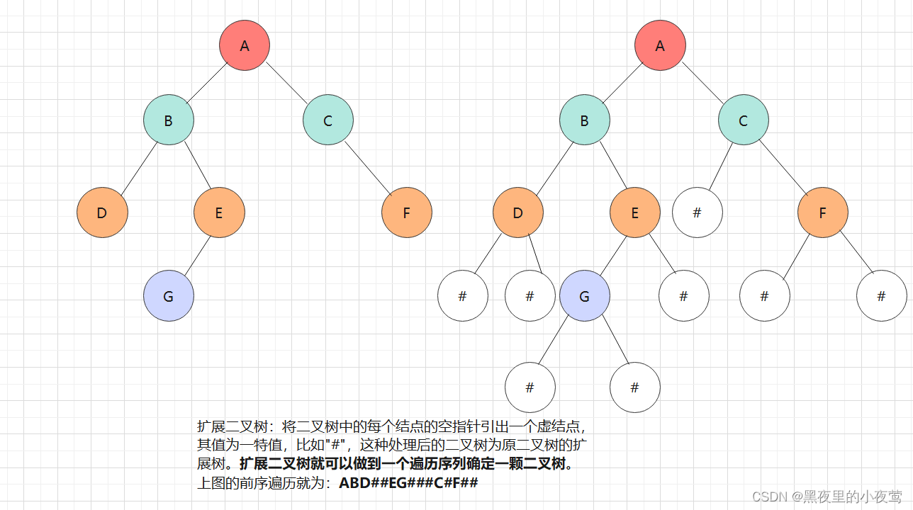 扩展二叉树:将二叉树中的每个结点的空指针引出一个虚结点,其值为一特值,比如"#",这种处理后的二叉树为原二叉树的扩展树。扩展二叉树就可以做到一个遍历序列确定一颗二叉树。如下图(前序遍历扩展二叉树,介绍的也是这种):