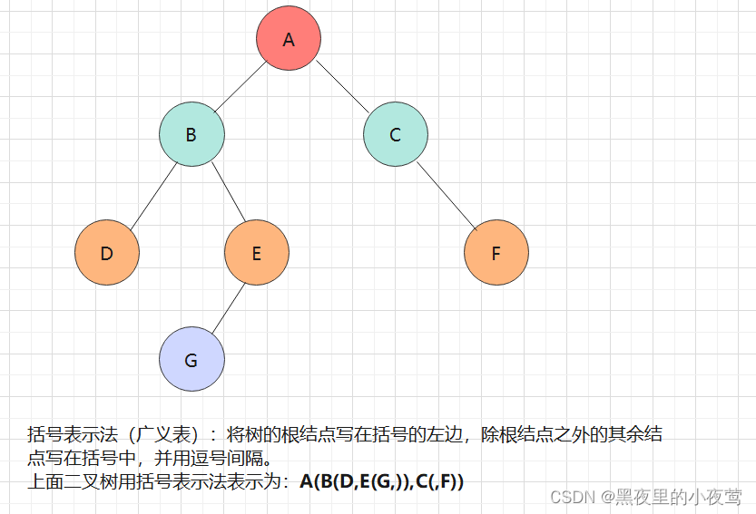 扩号表示法(本质广义表)是树的一种表示。它的表示方法:将树的根结点写在括号的左边,除根结点之外的其余结点写在扩号中,并用逗号隔开。如下图: