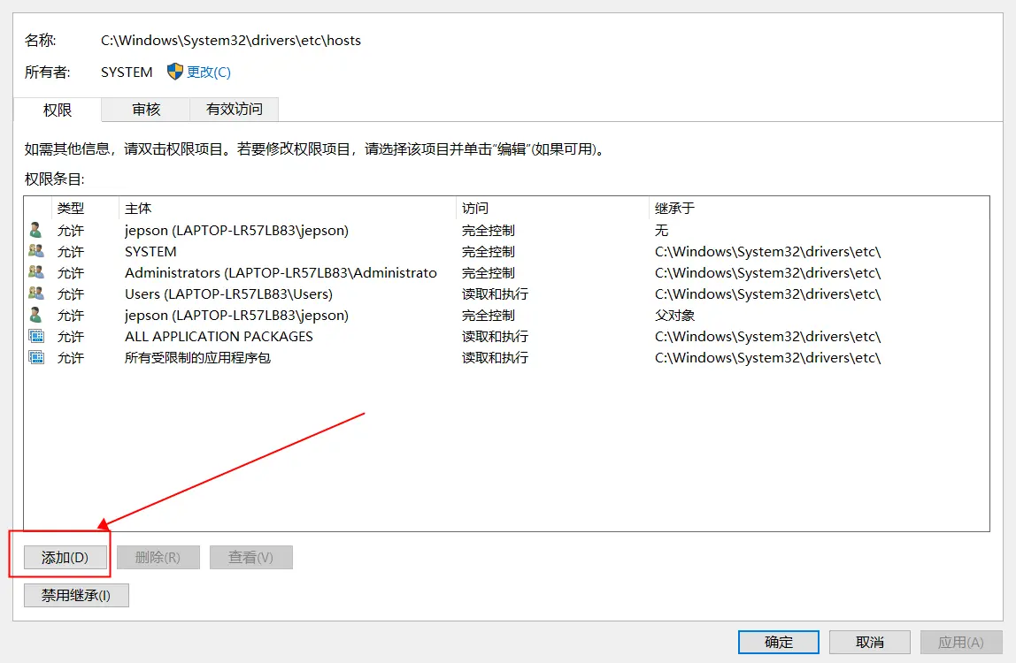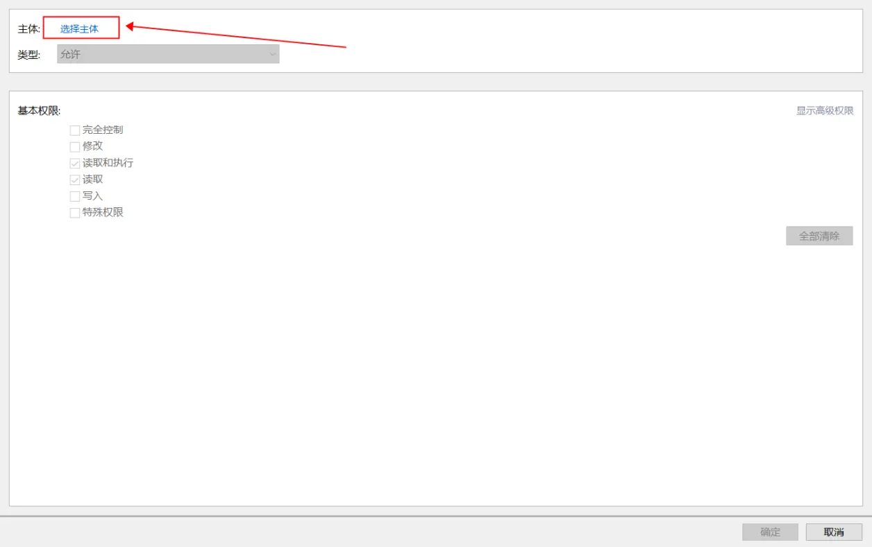 6.点击hosts的权限项目窗口下面的主体的“选择主体”,如下图所示。