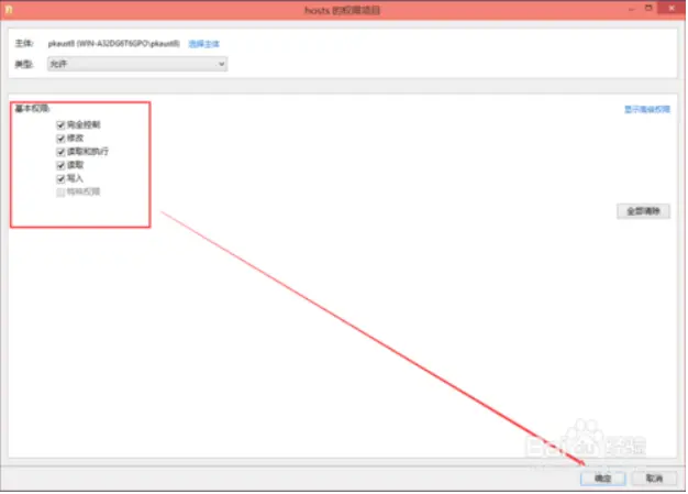 10.将hosts的权限项目界面下的基本权限的所以项目都勾选上,然后点击确定,如下图所示。