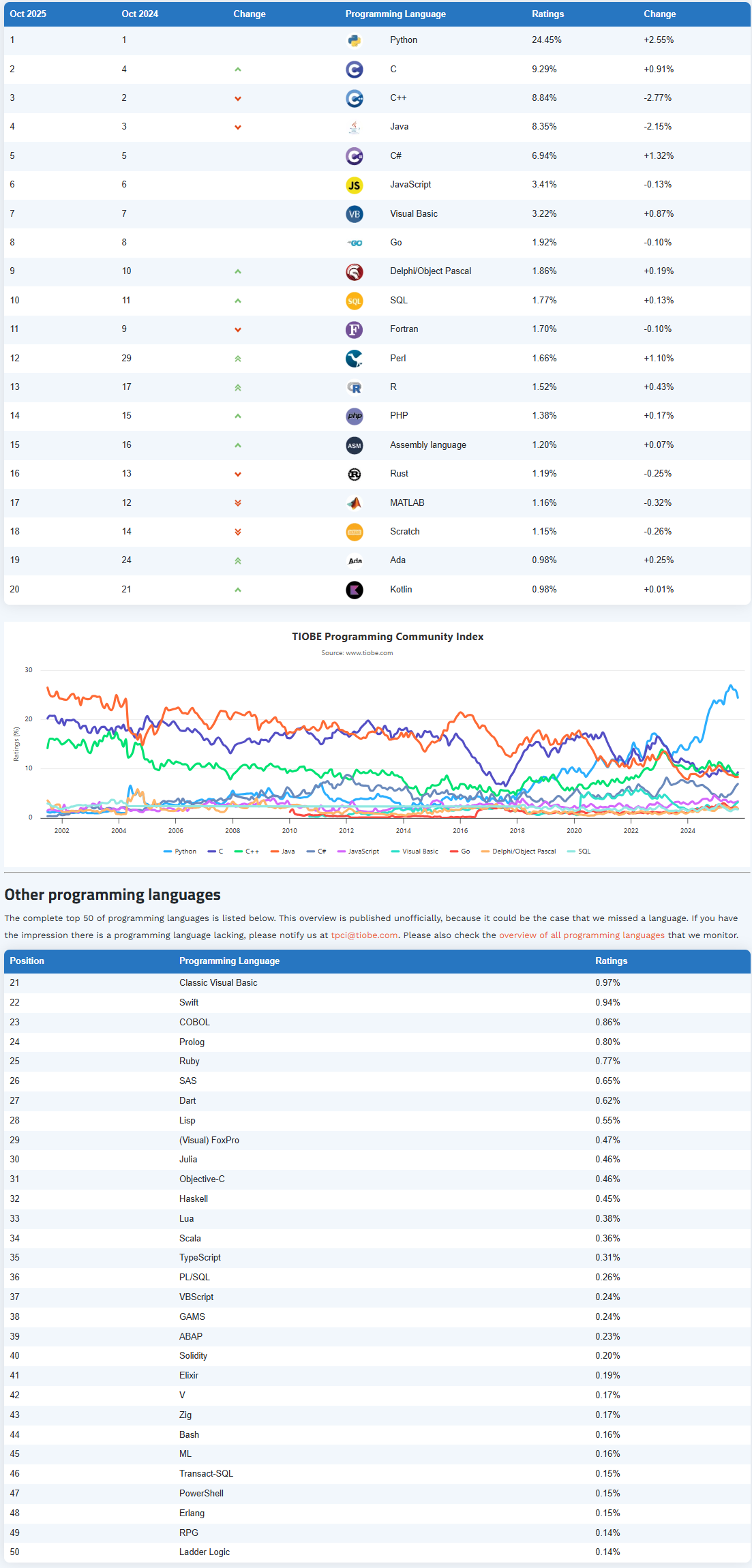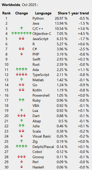 本月,由于C23版本的采用,C又回到了第二位。但是Java刚刚发布了版本25,而C++正忙于版本C++26。因此,尚不清楚哪种语言会获胜。