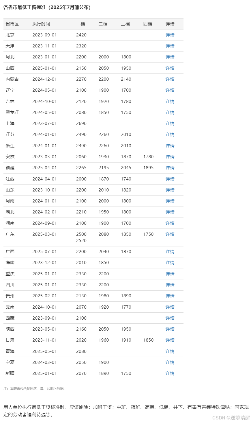 十、全国各地区最低工资标准(截至2025年7月)
