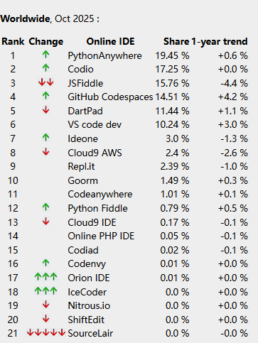 TOP ODE指数是通过分析在谷歌上搜索在线IDE名称的频率而创建的