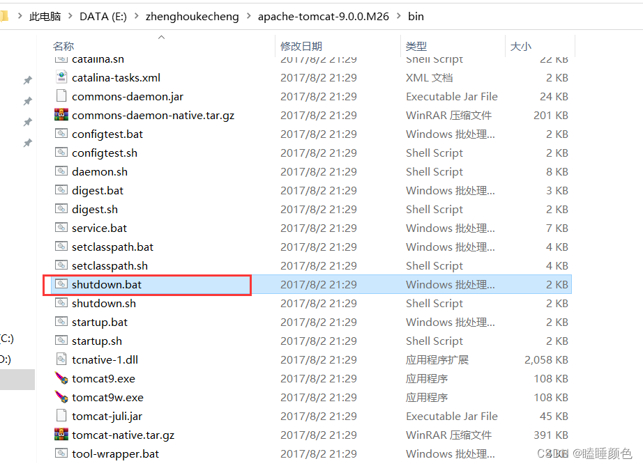 我们关闭Tomcat是双击bin目录下的shutdown.bat文件,等它运行完就自动关闭了。当然也可以直接点击右上角的叉关闭,但是这样关闭就比较粗暴了。