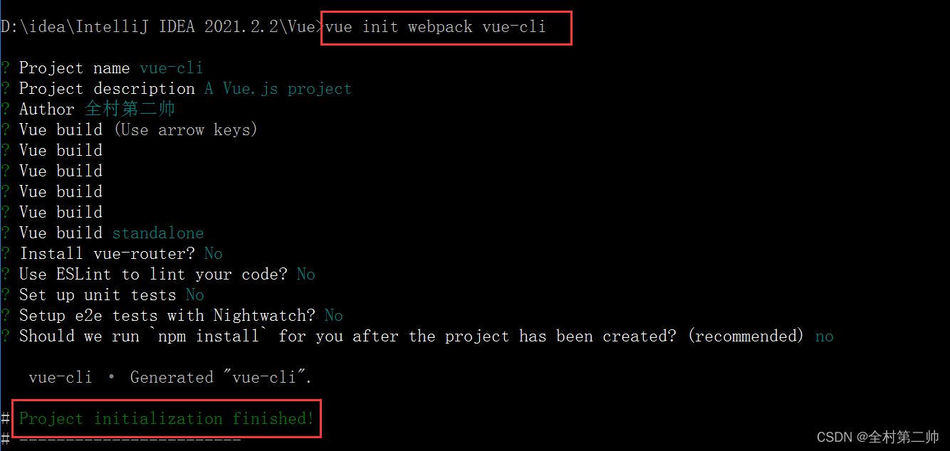 Should we run npm install for you after the,project has been created:创建完成后直接初始化,选择n,我们手动执行;运行结果!