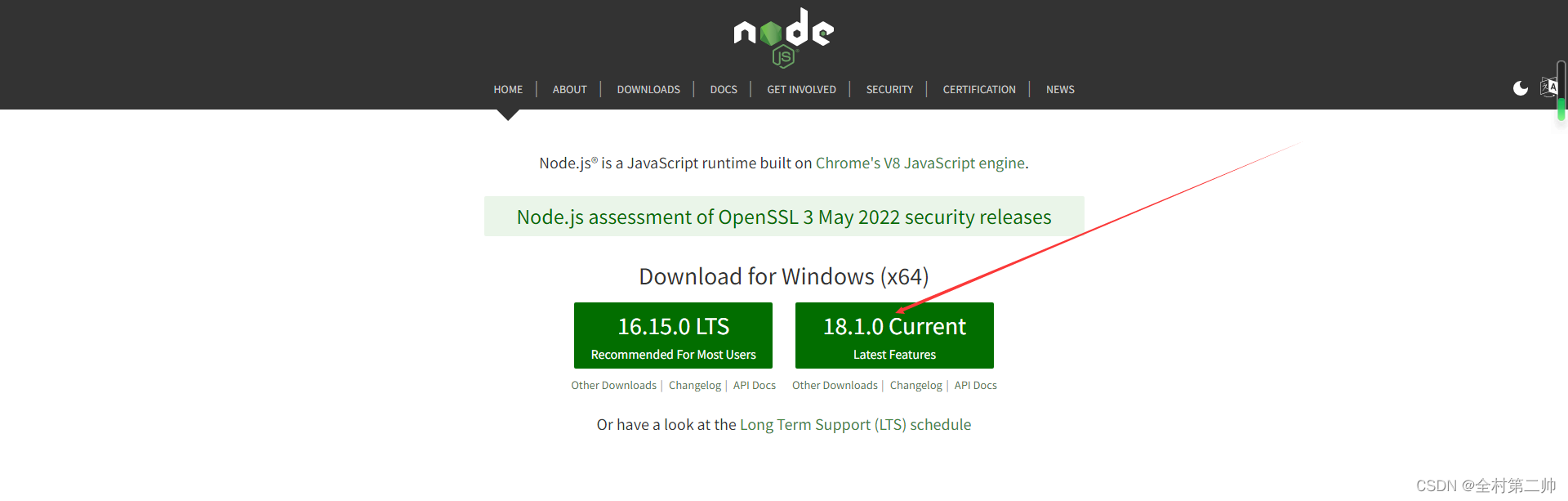 Node.js 是一个基于 Chrome V8 引擎的 JavaScript 运行环境。它 是一个让 JavaScript 运行在服务端的开发平台,能让JavaScript 成为与PHP、Python、Perl、Ruby等服务端语言平起平坐的脚本语言。进入node.js官网,可以看见它的版本已经更新到了18.1.0,如果你选择下载16版本的会出现很多安装问题。node.js安装是比较傻瓜式的,直接点击下一步就行。