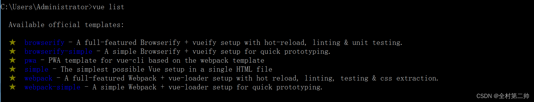 #测试是否安装成功,可以查看基于哪些模板创建vue应用程序,通常我们选择webpack
