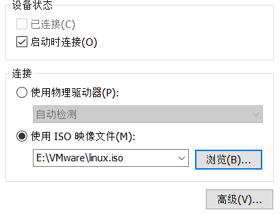 打开 VMware,点击虚拟机>>设置>>CD/DVD,然后在右侧的“连接”中选择“使用ISO映像文件”,再选择 VMware 目录中的 linux.iso 文件,选择好了之后点击确定即可。