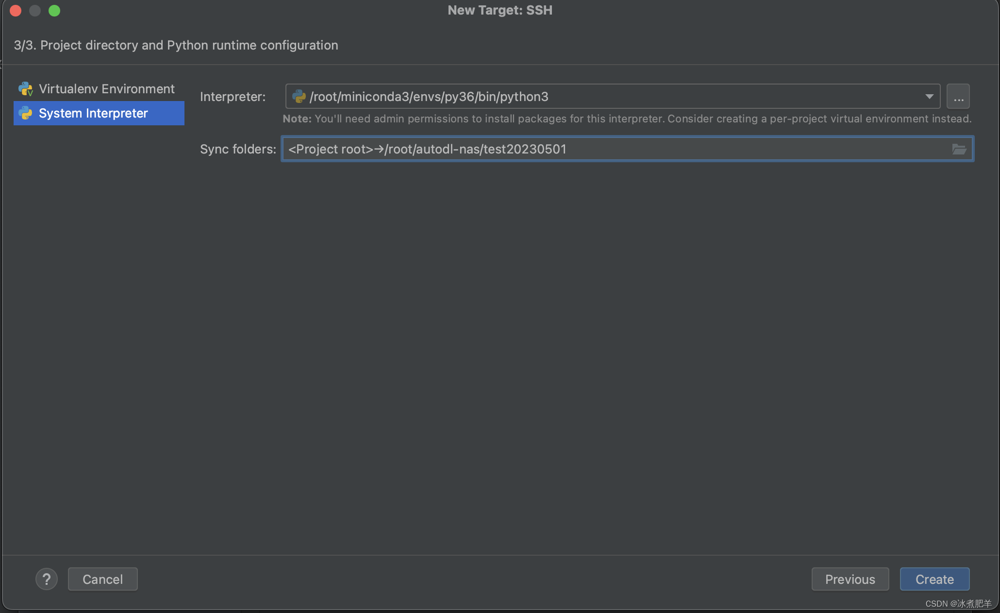 说明:我对于这里选择virtualenv environment和system interpreter的理解,这里的system interpreter是指服务器上的解释器,而virtualenv environment我理解是在服务器上再创建一个新的环境,所以我们应该选择system interpreter。而mac os和win端的此处有些不同,建议根据系统选择相应的博文参考更有价值。